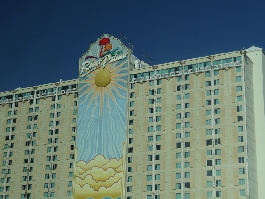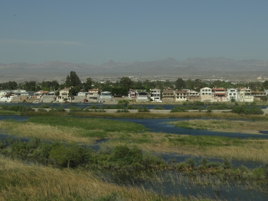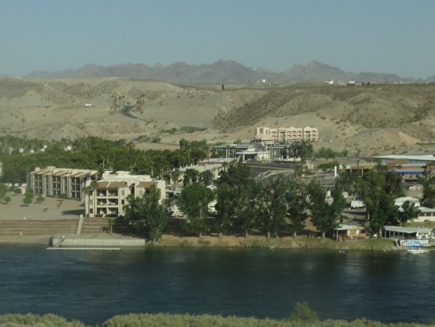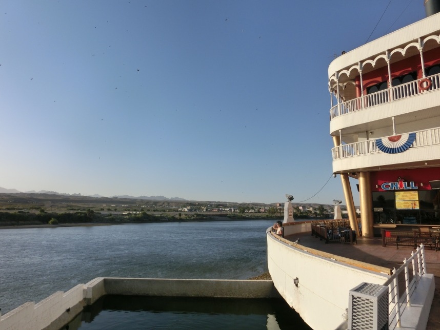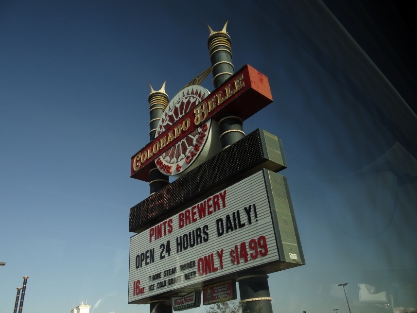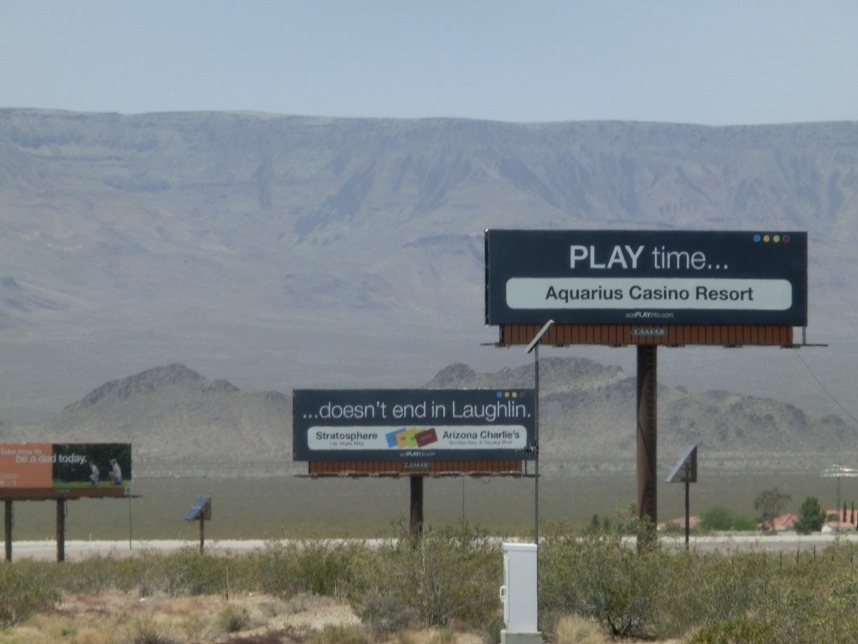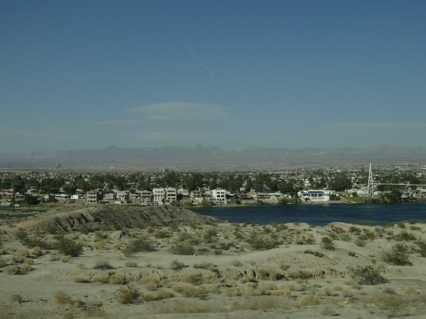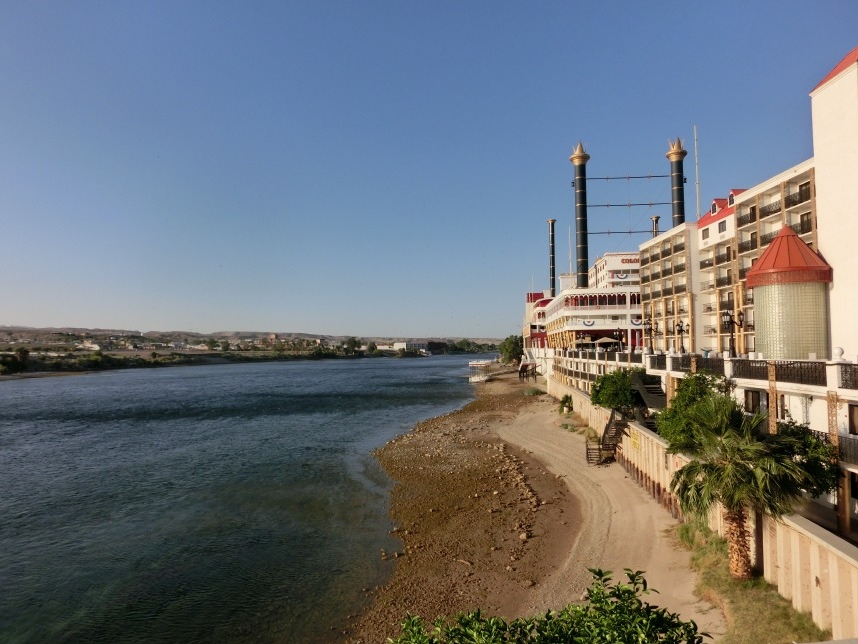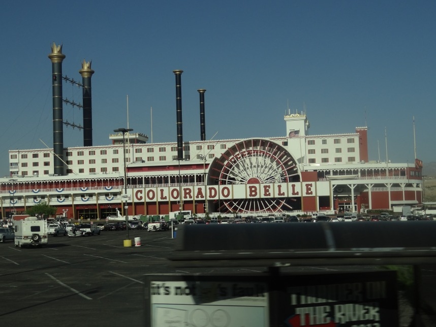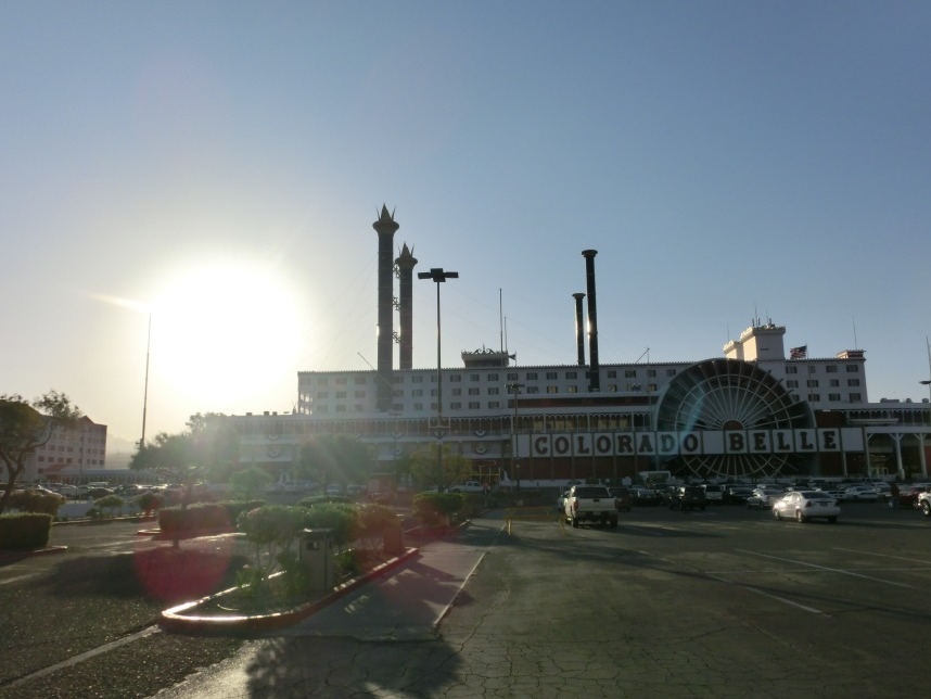 Nach weiteren 3 Stunden sind wir in Nevada, genauer gesagt überqueren wir nach wenigen Kilometern durch Bullhead City (Arizona) den Colorado River und laufen in Laughlin ein. Wer nicht zufällig schonmal in der Nähe war, dem wird Laughlin genauso wenig ein Begriff sein, wie es bei uns zunächst der Fall ist. Schon beim Schmökern durch den Lonely Planet bin ich auf eine kurzatmige aber einprägsame Beschreibung gestoßen, die Laughlin in genau einem Absatz abfrühstückt: als „Las Vegas für Arme“. Ein anderer Reiseführer sprach vom „dusty retirement village“ (also dem „staubigen Rentnerdorf“) – na, das kann ja heiter werden 😀