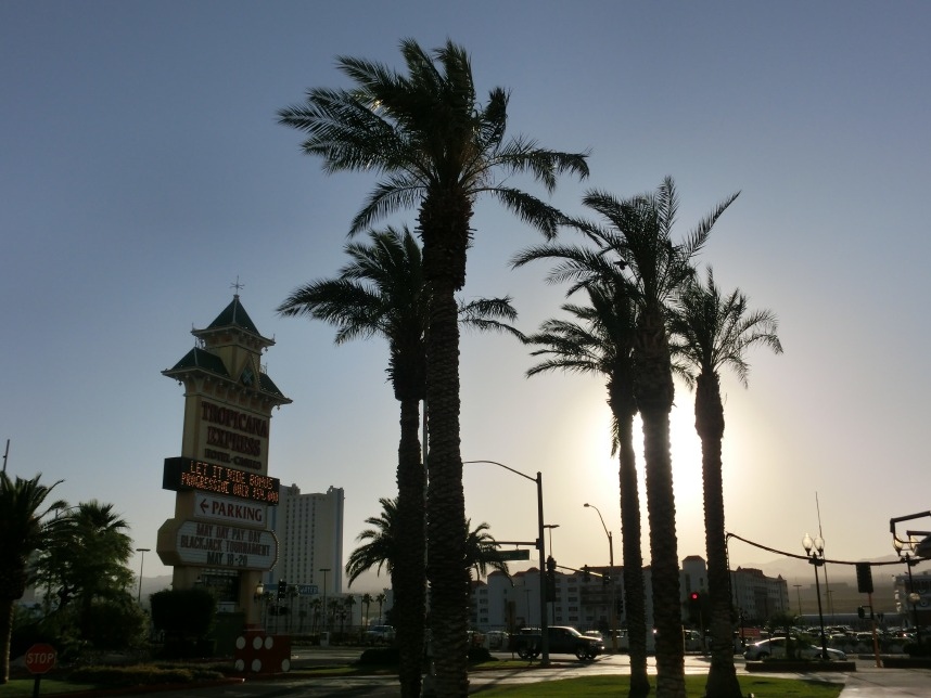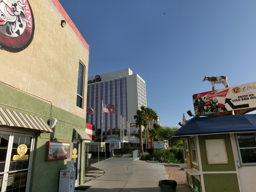 Am Abend erkunden wir mal etwas die Umgebung und stellen schnell fest, dass die Zielgruppe wohl in allen Resorts mindestens 60 Jahre alt ist. Dementsprechend bleibt das Unterhaltungsprogramm etwas auf der Strecke, einzig die ‚Chill!‚ Lounge im gegenüberliegenden Collorado Belle lockt mit (zumindest an diesem Abend) guter Livemusik und einer Außenbewirtung. Auf den umliegenden Parkflächen kann man derweil mit Einbruch der Dunkelheit tierische Bekanntschaften mit Waschbären und sogar Stinktieren schließen – letzteren sollte man jedoch nicht unbedingt zu nahe kommen… Zurück im Tropicana Express wagen wir auch die ersten, vorsichtigen Annäherungen mit einer anderen gefährlichen Spezies: den Spielautomaten 😉 Schnell hat sich eine kleine Formation rüstiger Seniorinnen um uns gebildet, die uns begeistert mitteilen, welche Städte („Heidelböörg“) und Personen sie so alles in Deutschland kennen. Mit diesen goldigen Anekdoten geht es für uns in die Koje, denn wir wollen am nächsten Morgen schon um 9 Uhr den Mietwagen in Empfang nehmen.